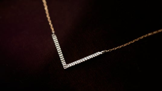 CASUCA "tovera narrow half" は2012年に放送された『最後から二番目の恋』で吉野千明が愛用していた "tovera 1 point stone" ネックレスに合わせて着けるのに最適なアイテム。新シリーズが決まった時、小泉今日子さんから「あれと重ね着けするのにぴったりなモチーフがあるといいかもね」という言葉をいただき、その小泉さんのアイデアをもとにCASUCAの「傷の輝き」をあわせて形にしたジュエリー。