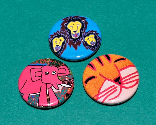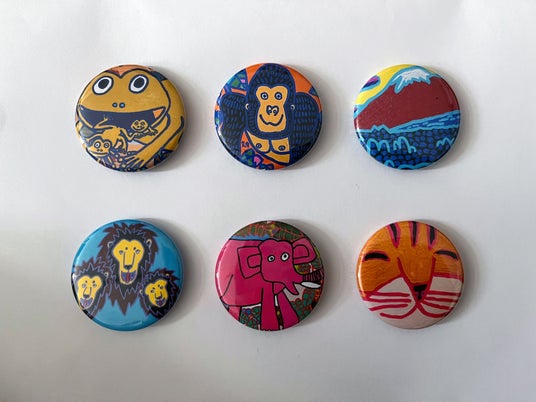 鮮やかでユニークな太田宏介さんのイラストが、かわいい缶バッジになりました!ライオン、ゾウ、ネコ、ゴリラ、カエル、富士山の6種類!