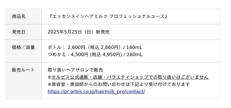 オルビス株式会社(本社:東京都品川区、代表取締役社長:山口裕絵、以下:オルビス)は、SNSでの話題化をきっかけにアウトバストリートメントに、"ミルク"という選択肢を確立※2し、アウトバスヘアケアNo.1商品として急成長を遂げた洗い流さないトリートメント『エッセンスインヘアミルク』より、さらに上質な仕上がりを目指すヘアケアのプレミアムラインとして、ヘアサロン専売品『エッセンスインヘアミルク プロフェッショナルユース』を2025年5月25日(日)より新たにローンチします。取り扱いヘアサロンにて順次展開していきます。