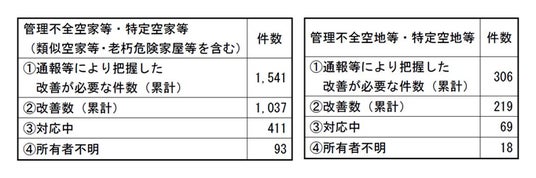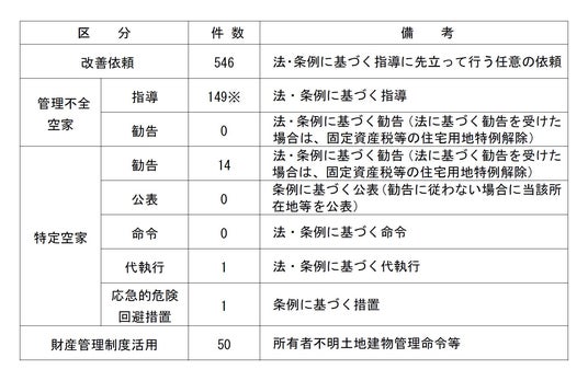 件数は、空家等(老朽危険家屋を含む)・空地等の合計 ※表に示される管理不全空家の指導は2024年4~5月に特定空家等として指導したものを含む。