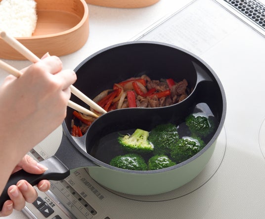 深さがあるので炒め物から煮物、汁物まで幅広い調理が可能です。おかずとスープを同時調理できるので朝ごはん作りにもオススメです。汁物は片側で約2人分作ることができます。内側はふっ素樹脂塗膜加工を施してあるため、料理がこびり付きにくくお手入れも簡単です。