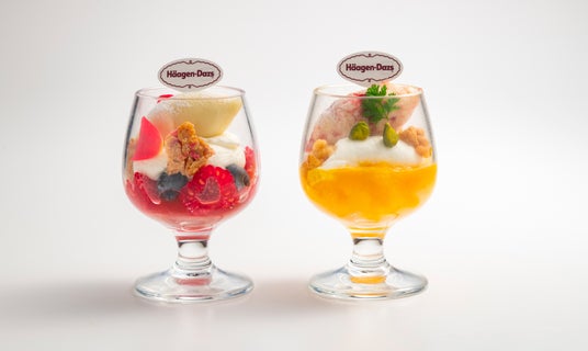 トロピカルフルーツのクリームに、香ばしくキャラメリゼしたヘーゼルナッツを合わせた夏らしいパフェ。コクのあるナッツの風味とハーゲンダッツ ストロベリーアイスクリームの爽やかな酸味が絶妙です。