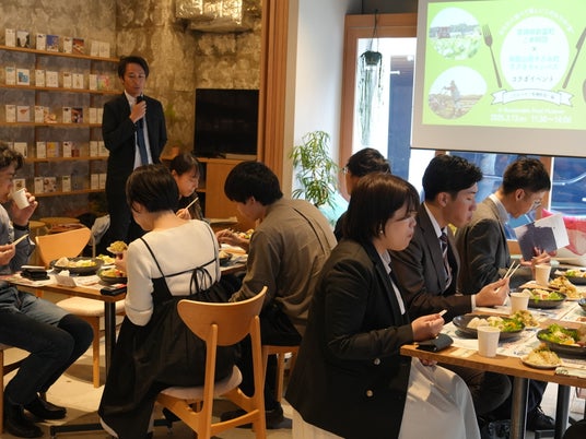 2025年3月 第1回開催の様子。地域独自の食材の説明を聞きながら企業担当者らによる交流が行われた