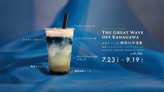 迫力ある波の描写が有名な《神奈川沖浪裏》は、濃厚な抹茶に爽やかな柑橘をあわせた『抹茶とジャスミンティーのグラニテソーダ』です。