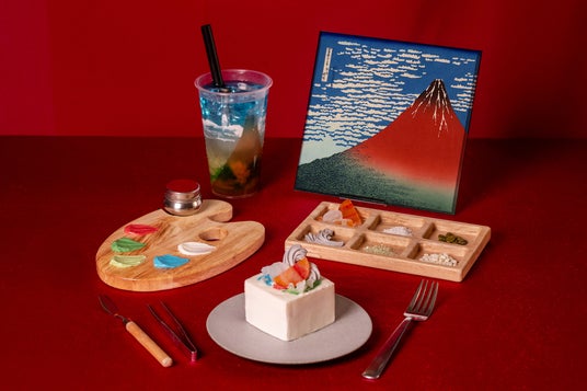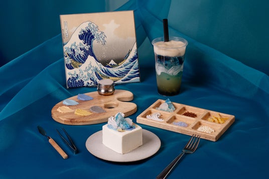 unimoccの人気メニュー、「キャンバス・ケーキ」は白いケーキをキャンバスに、本格的な道具で気軽にアート作品づくりを体験することができます。《北斎シリーズ》の提供期間中は、作品をイメージした5色のフレーバークリームとトッピングをお楽しみいただけます。