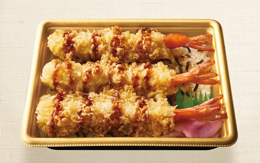 大きい海老を3尾使用した食べ応えのある天重です。ごま油の豊かな香りが広がる上がけのタレとて、醤油の香りと甘みのあるだしの効いた別添タレが特長です。