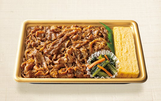 旨みのあるアンガス牛を甘みとコクのあるタレで仕上げました。アクセントとして甘辛く炒めたごぼうを合わせました。昆布とかつおのだしが効いた厚焼玉子もお楽しみいただけます。