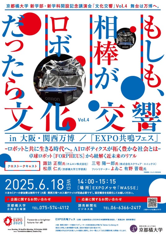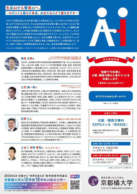 【京都橘大学】オムロン×スクウェア・エニックス×京都橘大学 司会によゐこ・有野晋哉氏を迎え、AIロボティクスについて語る特別講演会を大阪・関西万博にて開催します