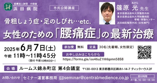 株式会社セントラルメディエンス(本社:東京都港区、代表取締役:中川隆太郎、以下「当社」)のグループ医療法人である、医療法人財団 小畑会 浜田病院(所在地:東京都千代田区、院長:合阪幸三、以下「当院」)は、6月7日(土)に腰痛に関するセミナーを開催いたします。