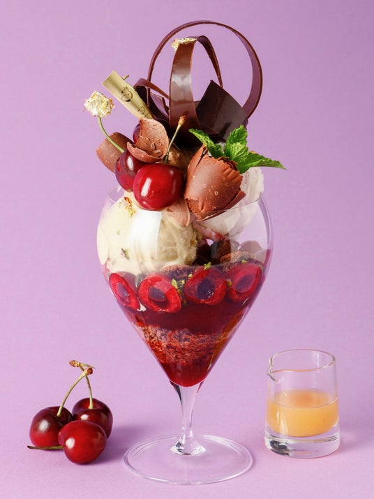 甘酸っぱく弾けるような食感のアメリカンチェリーにチョコレートクリームを合わせ、濃厚なチェリーバニラアイスとピスタチオアイスで贅沢な味わいに。チェリーの味わいがぎゅっと濃縮されたジュレやコンフィの華やかな甘さと相性抜群です。
