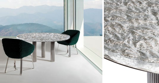 イタリアのムラーノ島で作られるヴェネチアン・グラスを大きな一枚ものの天板としてつかう「ミラー」テーブル。古くからのムラーノ細工の技法を学び、代々受け継いできた芸術家たちの能力が最大限に発揮されたコレクションです。このガラス天板は伝統技術を現代的な観点から再解釈し、全く型破りな製品を作り出してみたいという願望から生まれたものです。波打つようなガラスが生み出す美しい表情、大きく厚みのあるガラスを作るための鋳造工程特有の困難さは、この作品を真にユニークなものとしています。センターテーブル、サイドテーブルと多様なサイズ展開をしてきたコレクションに、新しくダイニングテーブルが追加されました。