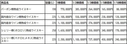 バーボン樽1樽購入の場合は、1本約2,200円程度、1/10でも1本約2,500円程度となります。ジャパニーズシングルモルトウイスキーとしては、大変お得です。