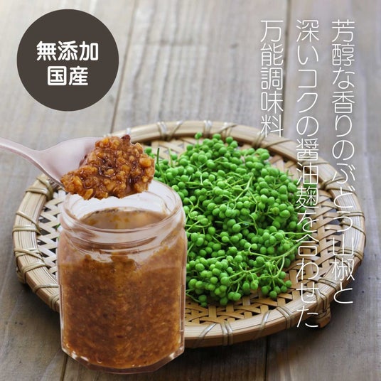 発酵の力で旨みを引き出した醤油麹に、爽やかな辛みと奥行きある香りのぶどう山椒を加えました。ピリリと心地よい刺激が、白ごはんや焼き野菜、豆腐などの味わいを引き立てます。