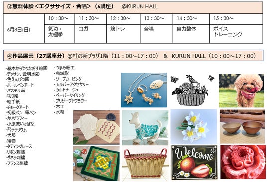 各会場では、作品展示やステージ発表のほか、無料エクササイズやワークショップなどを実施。さらに人気講師による作品販売も行います。