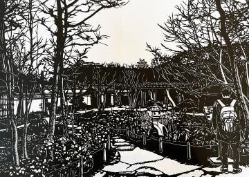 剪画(せんが)は黒い和紙を刃先で切り出して描く絵画です。好古園の風景や草花を剪画により表現した作品を展示します。