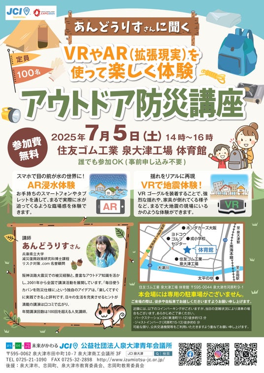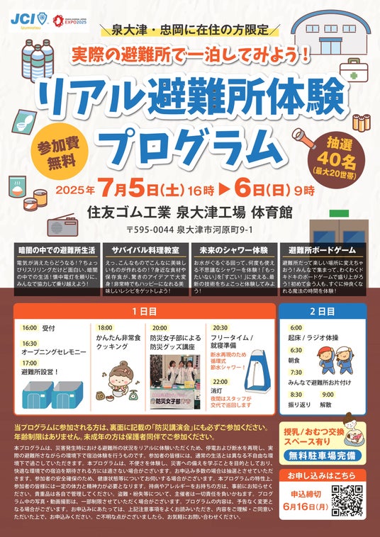 公益社団法人泉大津青年会議所(所在地:大阪府泉大津市、理事長:岡田勇一)は、地域住民の防災意識向上と災害対応力強化を目的とした、1泊2日の「リアル避難所体験」を、2025年7月5日(土)~6日(日)に住友ゴム工業(株)泉大津工場にて開催いたします。