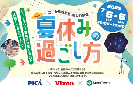 総合光学機器メーカー株式会社ビクセン(本社:埼玉県所沢市、代表取締役:新妻和重)は、2025年7月5日(土)~6日(日)の2日間にわたり、会場である東京都昭島市のショッピングセンター「モリタウン」と、神奈川県・山梨県・埼玉県・静岡県でアウトドア施設を運営する「PICAリゾート」とコラボし、夏休みの楽しみ方を提案する体験型イベントを開催いたします。
