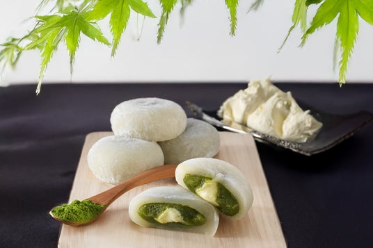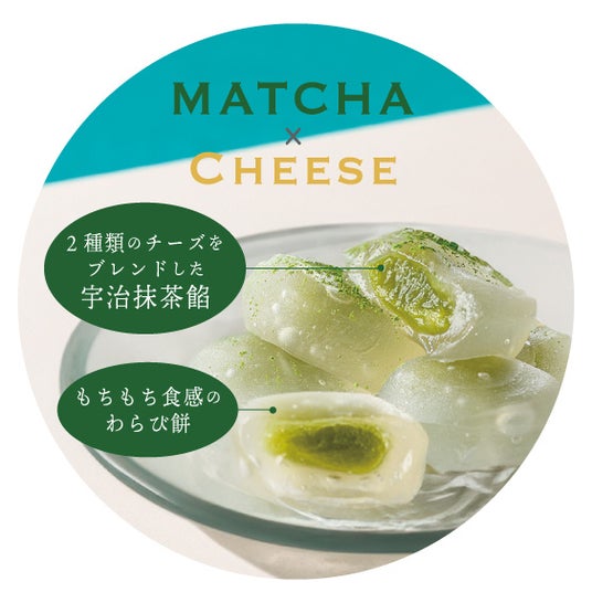 もちもち食感!2種のチーズと宇治抹茶餡のわらび餅マスカルポーネチーズとカマンベールチーズをブレンドした抹茶餡を甘みのあるもちもち食感のわらび餅で包み込みました。