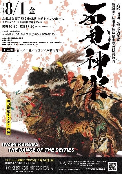令和7年8月1日(金曜日)に高槻城公園芸術文化劇場で、日本遺産にも登録されている、島根県西部の石見地方に伝わる伝統芸能「石見神楽」が公演されます。きらびやかな衣装を身にまとって勇壮な立ち回り、迫力ある激しい舞など日本を代表する歌舞を、ぜひご覧ください。