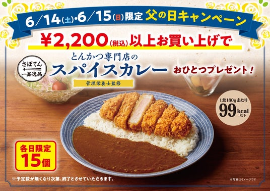 6月14日(土)、15日(日)は、「父の日キャンペーン」として、デリカ店舗で税込2,200円以上ご購入のお客様に、「さぼてん一品逸品」シリーズの「管理栄養士監修 とんかつ専門店のスパイスカレー」をプレゼントいたします。とんかつとの相性を追求し、揚げたてサクサクのパン粉の甘みや肉の柔らかな旨みを引き立てる、独自配合の香辛料のスパイシーな味わいが特徴。さぼてんの管理栄養士が監修した、低脂質で糖質控えめな、健康にも配慮したレトルトカレーです。