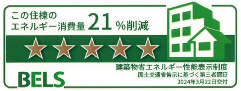 ※1 BELS(ベルス)とは、Building-Housing Energy-efficiency Labeling Systemの略称で、建築物における省エネ性能を第三者評価機が評価し認定する制度です。住宅の外皮性能および一次消費エネルギー量を5段階で評価し、★の数が多い程、高性能な建物として評価されます。