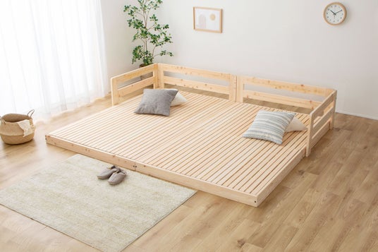 家族で寝るなら国産ひのきのファミリーベッド。専用金具でピッタリと連結できるので、隙間もなく家族で広々寝られるすのこベッドフレームです。サイドガードが付いているため、掛け布団がずれる心配はありません。床板は通常すのこ・繊細すのこ・い草張り床板の3種類からお選びいただけます。布団・マットレスどちらでもご使用可能です。