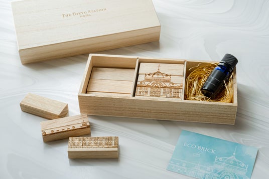 楠の端材を再利用した天然防虫ブロックと、ホテルオリジナル配合のアロマオイル。熟練の職人が手がけた100%天然素材のアイテムは、香りとぬくもりで、毎日の暮らしにやさしく寄り添います。アロマはベルガモット・パチュリ・クスノキをブレンドしました。表面に東京駅丸の内駅舎のレーザー刻印入りで贈り物にも最適。人にも地球にもやさしい、SDGsなエコプロダクトです。
