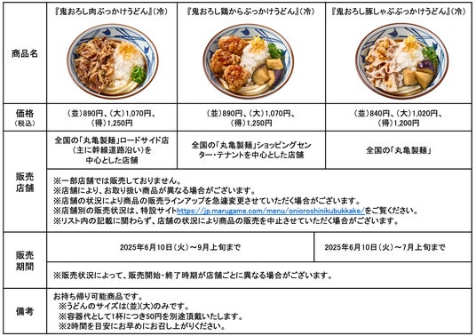 株式会社丸亀製麺(本社:東京都渋谷区、代表取締役社長:山口 寛)が展開する、食の感動体験を探求し、手づくり・できたてにこだわる讃岐うどん専門店「丸亀製麺」は、2025年6月10日(火)より、「鬼おろしシリーズ」を3種類同時に販売します。夏の一番人気※1『鬼おろし肉ぶっかけうどん』を全国のロードサイド店(主に幹線道路沿い)を中心とした店舗にて、『鬼おろし鶏からぶっかけうどん』を全国のショッピングセンター・テナントを中心とした店舗にて、全国の丸亀製麺では『鬼おろし豚しゃぶぶっかけうどん』を販売します。