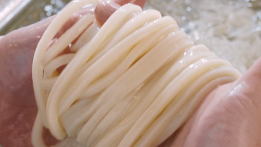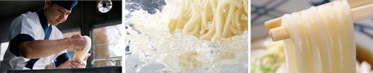 冷たいうどんは、茹で上がり後、水でしっかりと麺を締めることで、口に入れた瞬間からつるつると滑らかな口あたり。噛んだ瞬間にもちっと心地よいコシをご堪能いただくことができ、食欲の落ちがちな夏にもおすすめです。