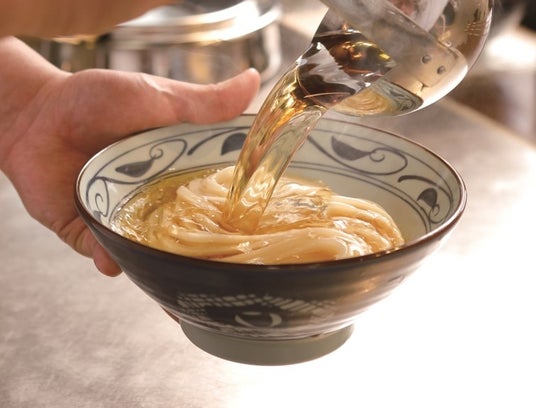 だしは、鰹やうるめなど複数の削り節とニボシや昆布からとる旨みに塩味が加わった、調和のとれたすっきりとした味わいが特徴です。打ち立ての冷たいうどんと絡めた際に、だしの風味や旨みがより強く感じられるよう、試行錯誤を行い、暑い時期に最後まで麺とだしをひんやりとおいしく味わっていただけるように配合や温度管理にこだわっています。