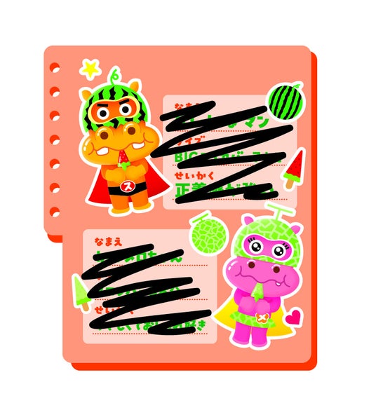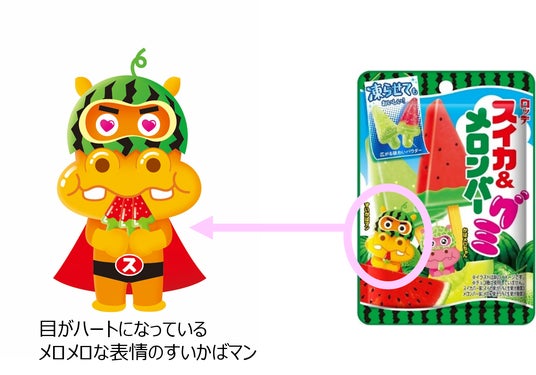パッケージデザインですが、実はグミのおいしさにメロメロな表情になっている「すいかばマン」と「かばメロちゃん」のデザインもあります。