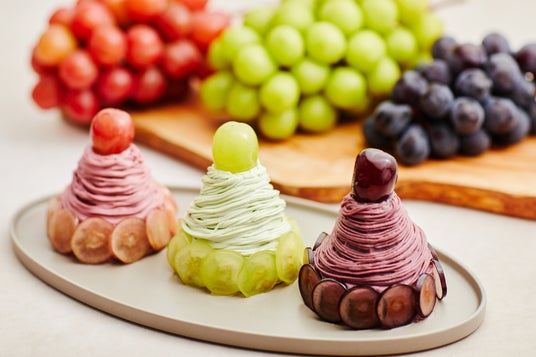 今年新登場の「葡萄のこぼれタルト」(*2)は、シャインマスカットとサンシャインレッドをふんだんに使い、みずみずしい葡萄の甘味と酸味を存分に味わえるのが特徴です。「葡萄モンブラン」は山梨生まれの3品種、スカーレット、マスカサーティーン、富士の輝を使用した3種類を用意。すっきりとした甘さから濃厚でコクのある甘さまで品種ごとの味わいを楽しめます。さらに、毎日3種類の「葡萄の生絞りジュース」も提供し、巨峰やナイアガラといった王道の品種から、サンシャインレッドやロザリオビアンコなど普段ジュースで味わうことのない珍しい品種まで楽しめます。モンブランやタルト、ジュースで品種ごとに異なる葡萄の味わいや見た目を楽しめる、葡萄の生産量日本一の山梨県ならではの体験です。