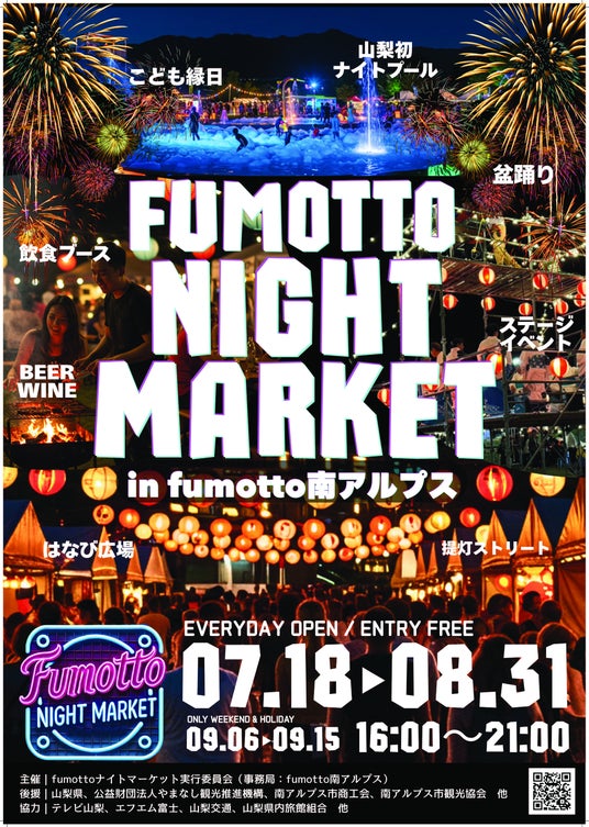 2025年7月18日(金)から8月31日(日)までの夏休み期間、南アルプスIC前「fumotto南アルプス」において、山梨初となる本格的なナイトマーケットを毎晩開催します。会場は、ネオン看板と2,000個の提灯で幻想的に彩り、非日常的な夏の夜を演出します。さらに、地元の食材を使ったグルメブースやワイン&ビアバー、農産物や加工品、クラフト雑貨やアンティックの販売など、多彩な店舗が出店します。