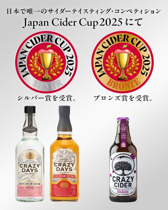 さらに、日本で唯一のサイダーテイスティング・コンペティション「Japan Cider Cup 2025」にて「CRAZY CIDER CASSIS」がブロンズ賞、「CRAZY DAYS WHITE DREAM EDITION」と「CRAZY DAYS RED DREAM EDITION」がシルバー賞を受賞したことをご報告いたします。