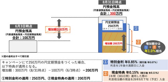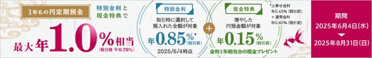 本キャンペーンでは、2025年6月4日(水)から8月31日(日)の期間中に新規で預け入れされた1年もの円定期預金に対し、通常金利年0.40%(税引後 年0.31%)(注)に年0.45%(税引後 年0.35%)を上乗せした【1.】特別金利年0.85%(税引後 年0.67%)を提供します。