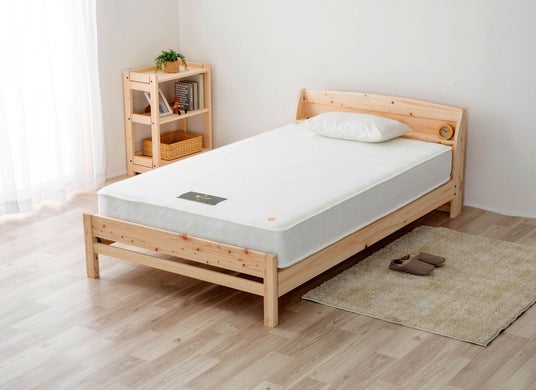 便利なコンセントと棚が付いた、大人気のすのこベッドフレーム。厳選された島根県・高知県産の最高級ひのきを全面に使用。上質な香りに包まれながら、心地よい安らぎのある睡眠をお届けします。無塗装なため、お子様にも安心してご使用いただけます。