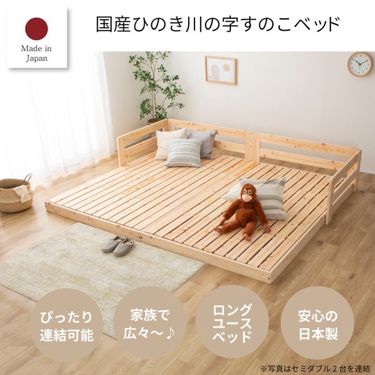 家族で寝るなら国産ひのきのファミリーベッド。専用金具でピッタリと連結できるので、隙間もなく家族で広々寝られるすのこベッドフレームです。サイドガードが付いているため、掛け布団がずれる心配はありません。床板は通常すのこ・繊細すのこ・い草張り床板の3種類からお選びいただけます。布団・マットレスどちらでもご使用可能です。