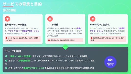昨今、若年層への効果的なリーチ手法として"リアルイベント"や"体験型プロモーション"の重要性が再認識されています。しかし、都心部のスペース費用や運営コストの高騰により、中小企業や地方企業、スタートアップにとっては、都内一等地での開催ハードルが極めて高い状況が続いています。また、PRや広告の分野では、SNSやインフルエンサーを活用した「共感型プロモーション」が主流となる中で、発信力を持つ若手クリエイターやタレントとの連携がうまく機能していない企業も多く存在します。