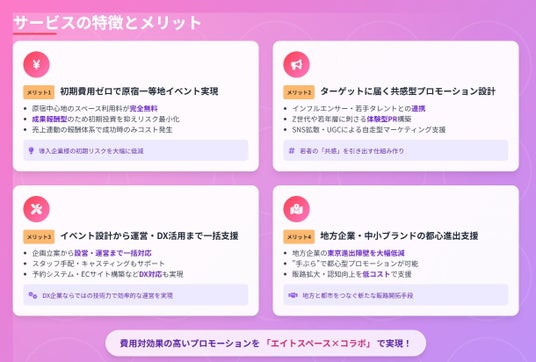 本サービスは、イベントスペースを"利用料無料・売上連動型"で提供する業界初の取り組みで、若年層をターゲットとする企業や広告代理店様が、初期コストを抑えたプロモーションを原宿で展開できる仕組みです。