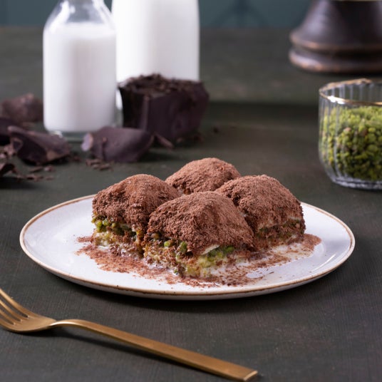 ナーディル・ギュルの看板商品<ピスタチオバクラヴァ>を、北海道産牛乳に浸し、仕上げにベルギー産チョコレートフレークをトッピング。