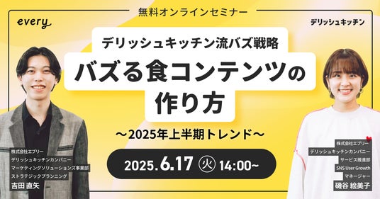 株式会社エブリー(本社:東京都港区、代表取締役:吉田 大成、以下エブリー)が運営するレシピ動画メディア『デリッシュキッチン』は、同メディアが保有する約3,000万の生活者データを用いた無料ウェビナーを、6月17日(火)に開催します。2025年上半期の食トレンドを振り返りと、デリッシュキッチンがこれまで培ったノウハウを活かしたバズコンテンツの作り方をご紹介します。