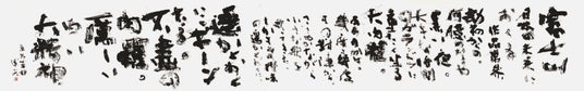 エントランスエリアには、国内外で活躍する代表的な書家の招待作品10点を展示します。101歳で毎日書道会最高顧問の中野北溟(ほくめい)さん「はれやか」(高さ81センチ×幅81センチ)、草野心平の詩を題材にした石飛博光(はっこう)さん「富士山」(高さ240センチ×幅1653センチ、成田山書道美術館蔵)のほか、仲川恭司さん(専修大学名誉教授)、赤平泰処さん(大正大学名誉教授)、薄田東仙さん、遠藤彊(きょう)さん、下谷洋子さん、中原志軒さん、永守蒼穹(そうきゅう)さん、北野攝山(せつざん)さんーーの作品が出品されます。さらに作品展示エリアには一流書家による大型作品201点、色紙468点が並び、多彩な書の世界を堪能できます。