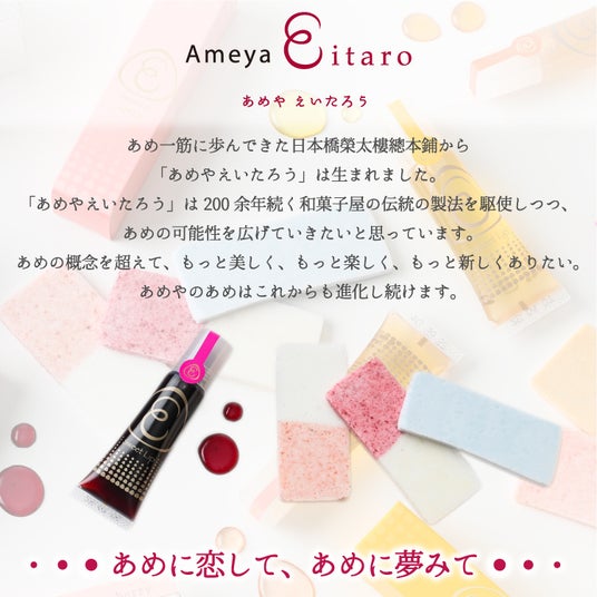 1818年創業の榮太樓總本鋪があめ専門店ブランドとして2007年に立ち上げたブランドが「Ameya Eitaro(あめやえいたろう)」です。200年続く和菓子屋の伝統製法を駆使しながら、こだわりの原料を活かし、「あめに恋して、あめに夢みて」をコンセプトに、概念に囚われない進化したあめの新しい形を表現し、あめの可能性を広げています。