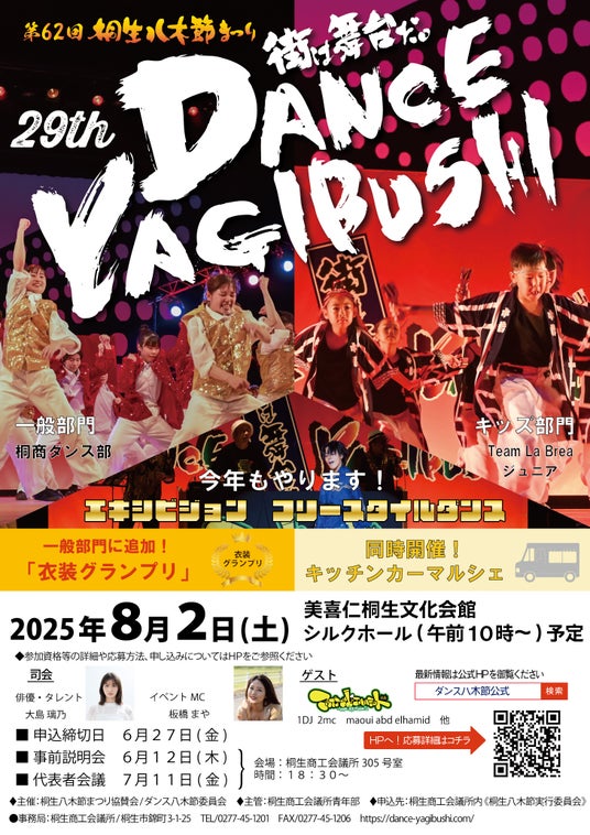 ▽主催=桐生八木節まつり協賛会/ダンス八木節委員会 ▽主管=桐生商工会議所青年部
