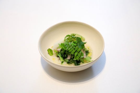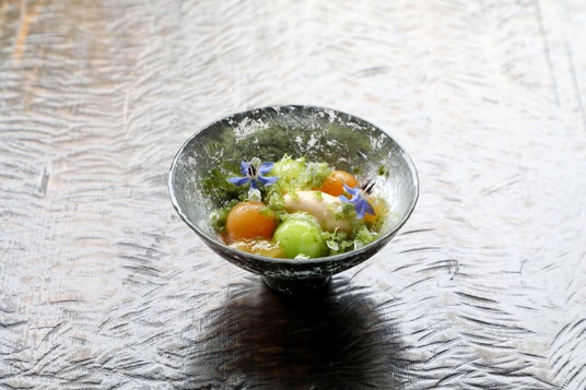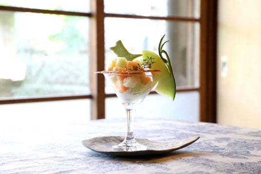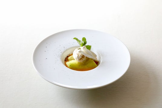 クレソンのシャーベットとエスプーマしたメロンの絶妙なハーモニーをお楽しみください。