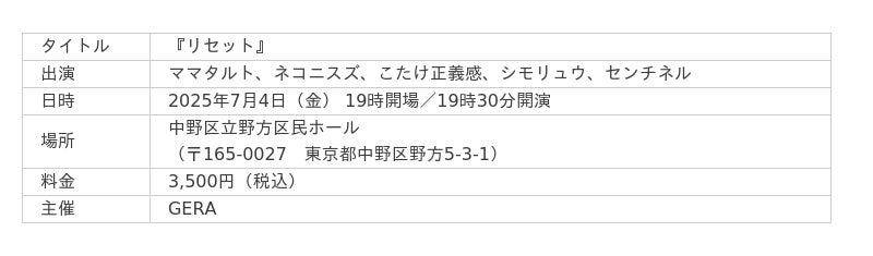 プロシューマー支援事業を展開する株式会社ファンコミュニケーションズ(本社:東京都渋谷区、代表取締役社長:二宮幸司 東京証券取引所プライム市場:2461)が運営する国内最大級のお笑いラジオアプリ「GERA(ゲラ)」は、主催ライブ『リセット』を2025年7月4日(金)に開催いたします。