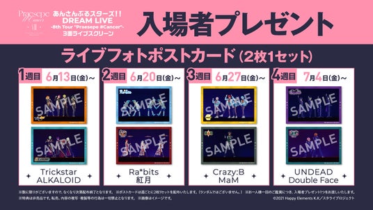 入場者プレゼントは、各ユニットの熱狂のライブシーンを切り取った「ライブフォトポストカード」を2枚1セットで配布。週ごとに配布するポストカードの絵柄が異なり、1週目(6月13日(金)~)はTrickstarとALKALOID、2週目(6月20日(金)~)はRa*bitsと紅月、3週目(6月27日(金)~)はCrazy:BとMaM、4週目(7月4日(金)~)はUNDEADとDouble Faceというそれぞれ2ユニットをセットにして数量限定で配布する。