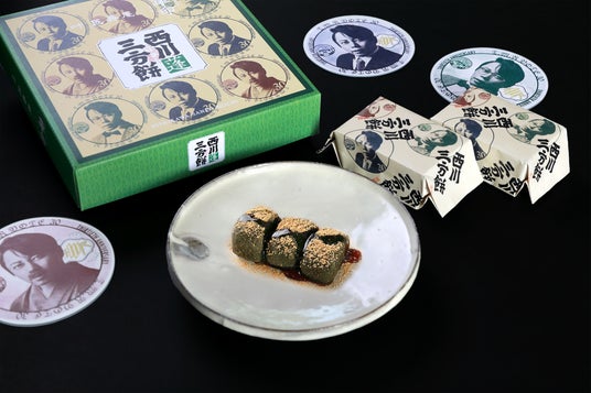 「西川三方餅(にしかわさんぽうもち)」は、2021年に発売された第1弾「西川餅」、2022年の第2弾「水羊羹 西川貴教Ver.」に続く3年ぶり3度目のコラボ商品。滋賀羽二重もちを使った3つのやわらかな蓬餅に、体づくりにも役立つ香ばしいきな粉(滋賀県産大豆使用)をまぶしています。のどに良いとされる、琉球和三盆糖使用の黒蜜をお好みでかけて、まろやかにお召し上がりください。