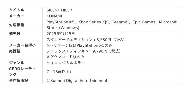株式会社コナミデジタルエンタテインメントは、『SILENT HILL f』(PlayStation(R)5、Xbox Series X|S、Steam(R)、Epic Games、Microsoft Store)の発売日が、2025年9月25日(木)に決定したことをお知らせします。