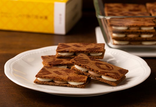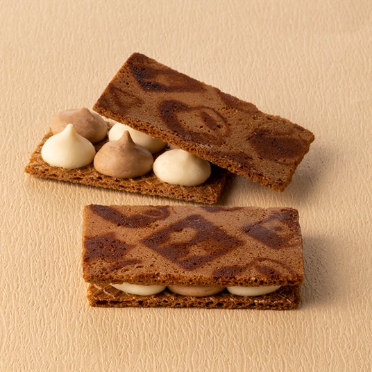 エチオピア産コーヒー豆から生まれるやさしい味わいの「コーヒーショコラ」と、欧州産マスカルポーネチーズを練りこんだコク深い「マスカルポーネショコラ」。きめ細かな泡でクリーミーに仕上げた2つのショコラを、ぷっくりしぼって交互に並べました。"喫茶店の世界"をココアパウダーで描いたサクサクの薄焼きクッキーで挟みこめば、『ティラミスショコラサンド』のできあがり。口の中でとろけてはじめて完成するティラミスの味わいをお愉しみください。